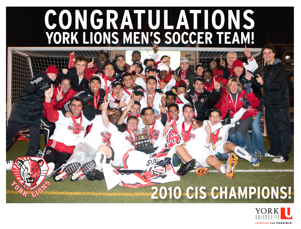 The York University Lions men’s soccer team was crowned national champions for the second time in three years as they defeated the UBC Thunderbirds 1-0 in the gold-medal match of the 2010 CIS championships at Varsity Centre, Sunday night (Nov. 14).